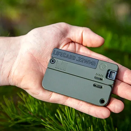 The LifeCard is the original credit card gun, setting the standard others follow. Our patented design folds to true wallet-size, offering reliable performance in .22 LR or more powerful .22 WMR. Engineered from aluminum and steel with integrated ammo storage, it is the undisputed leader in discreet, personal security. Choose the authentic LifeCard gun—the one that started it all.